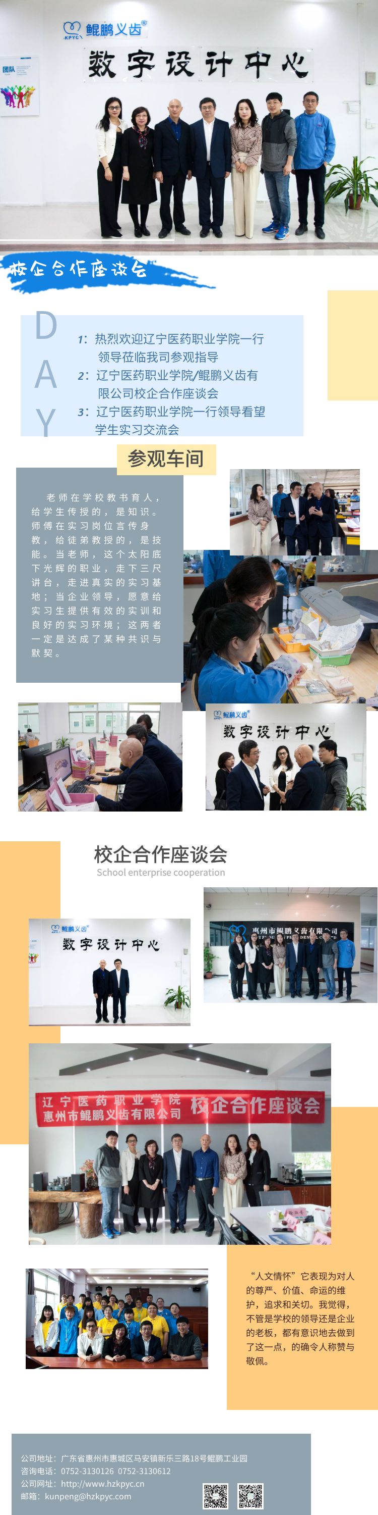 “師者如蘭,香遠益清”。我們一生會遇到很多的老師,父母,我們的第一任老師;教師,我們求學生涯的老師;師傅,我們工作崗位的老師......有句話說得好:“你上學的時候,你不懂的問題老師會教你,你工作的時候,你不會的東西,沒關(guān)系,讓會的人來”所以,當還有人愿意教你些東西的時候,你就應(yīng)該多聽一些教誨,潛下心來學習,學會做人的道理。無論將來你是否學有所成,還是富甲一方,都不要忘記給過你幫助的人?;蛟S當年你學到的知識早忘了,但是那份師生之情,感恩之情,即使不經(jīng)常掛在嘴邊,但是在心底,應(yīng)該是要一直記得的。熱烈歡迎遼寧醫(yī)藥職業(yè)學院一行領(lǐng)導(dǎo)蒞臨我司參觀指導(dǎo)暨熱烈慶祝遼寧醫(yī)藥職業(yè)學院與惠州市鯤鵬義齒有限公司校企合作座談會取得圓滿成功。