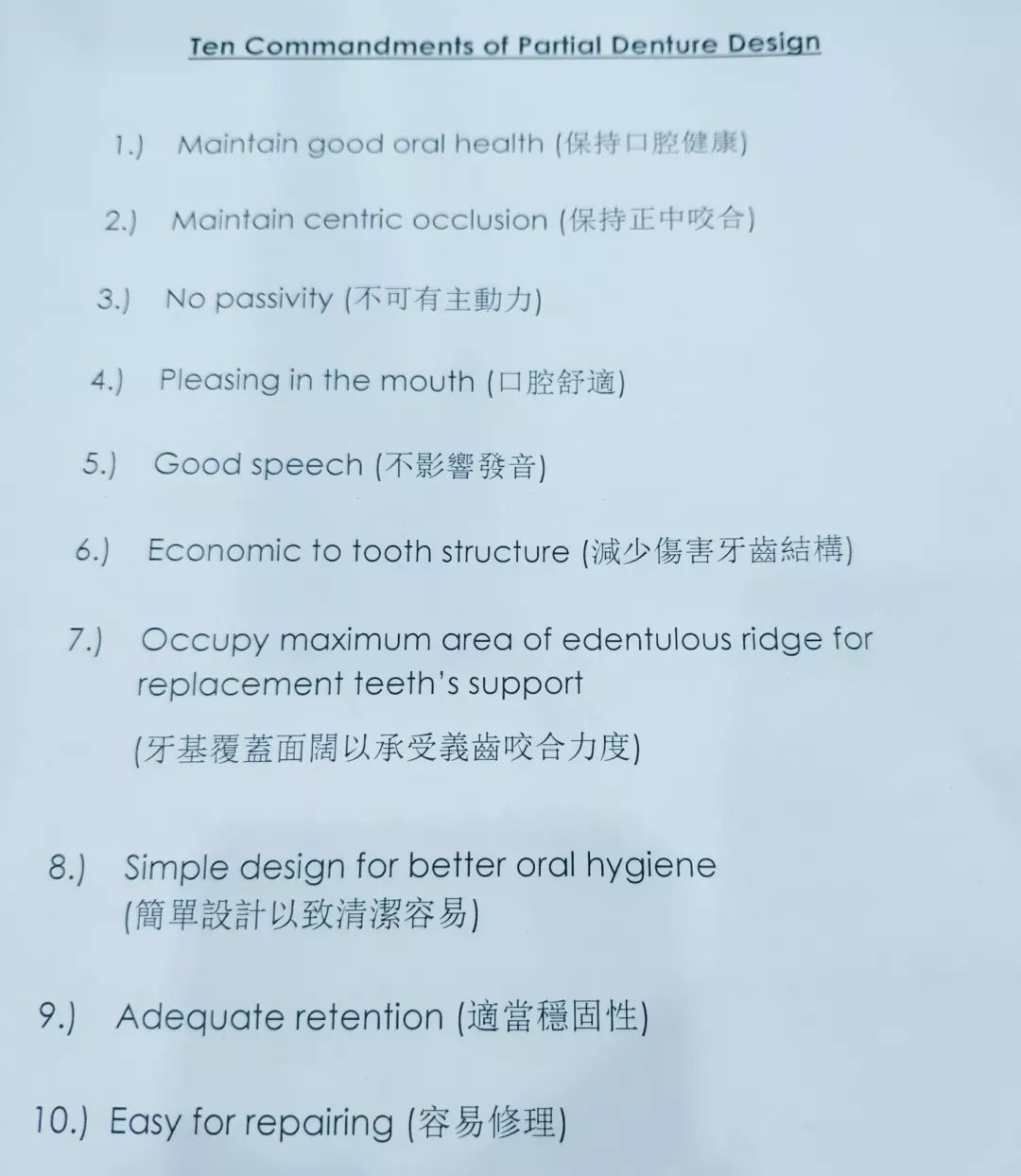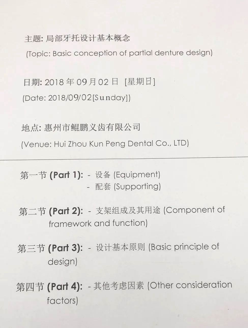 2018年9月2日(星期天)我們迎來(lái)了尊貴的客人。深圳高衛(wèi)的馮泰平馮老先生前來(lái)授課指導(dǎo)。授課主題(Topic):局部牙托設(shè)計(jì)基本概念(Basic conception of partial denture design)第一節(jié):設(shè)備和配套(Equipment and Supporting)第二節(jié):支架組成及其用途(Component of framework and function)第三節(jié):基本設(shè)計(jì)原則(Basic principle of design)第四節(jié):其他考慮因素(Other consideration factors)